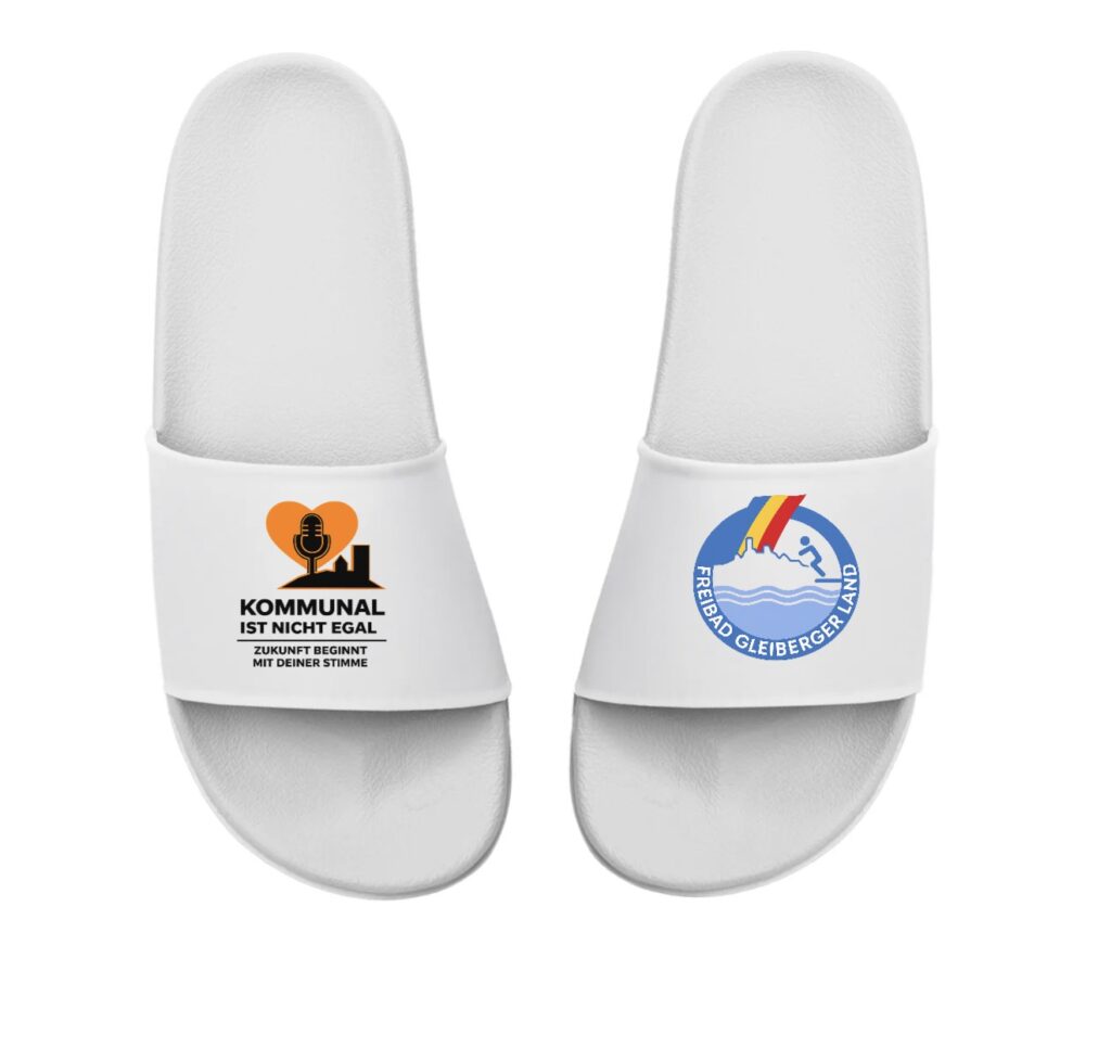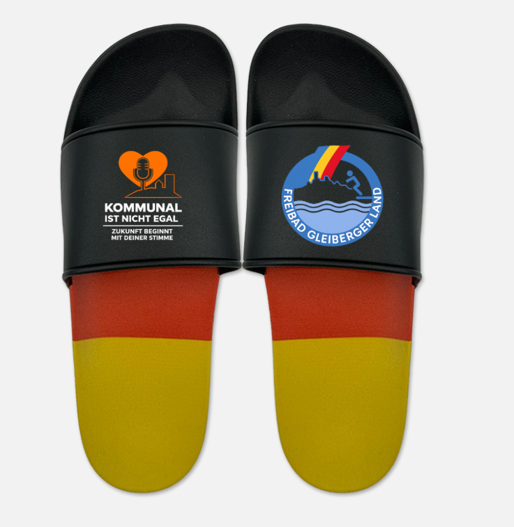 Die „Kommunal ist nicht egal“ Badelatschen für das Freibad Gleiberger Land erscheinen in der exklusiven Deutschland WM Edition.