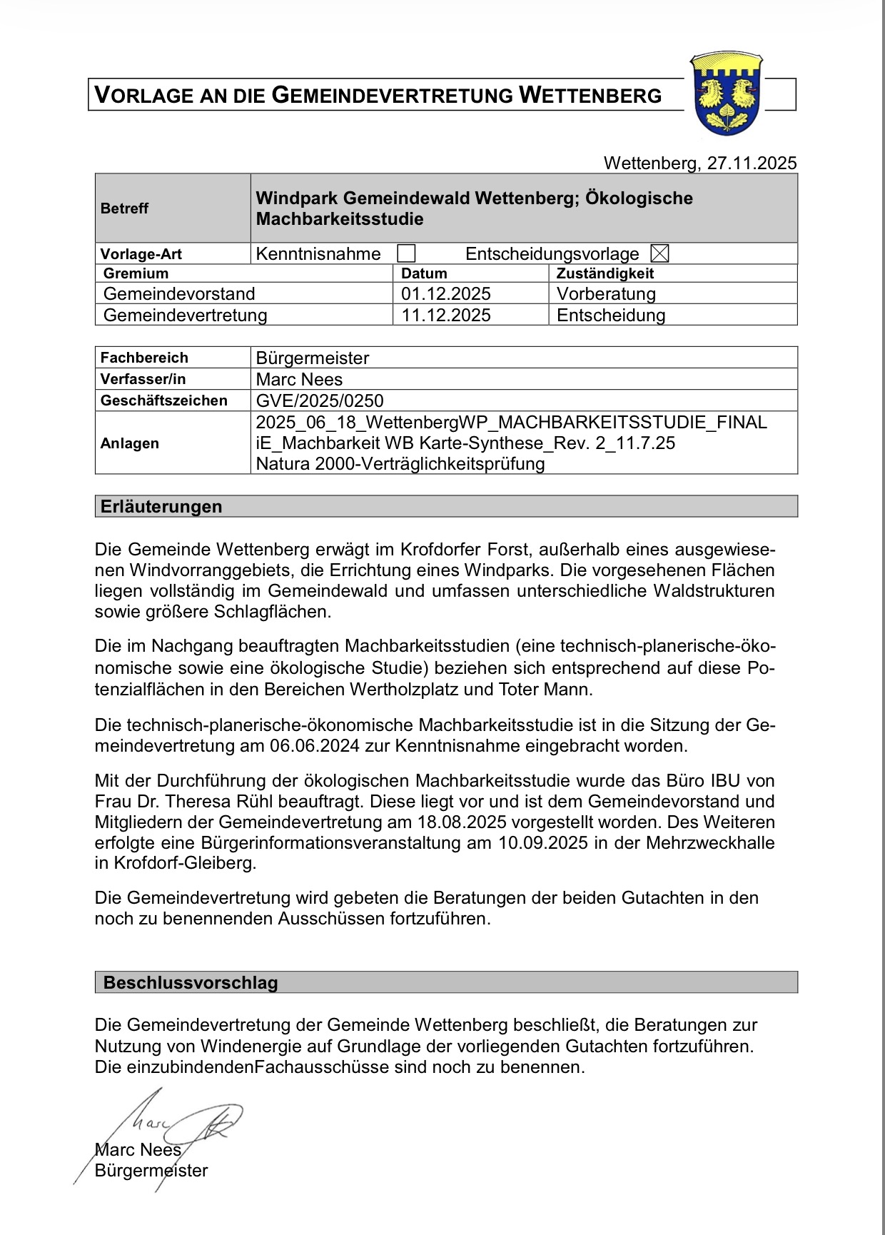 Konkret bedeutet das: Die Beschlussempfehlung, das Thema Windenergie auf Grundlage der vorliegenden Gutachten weiter in den zuständigen Ausschüssen zu beraten, ist ein Vorschlag des Bürgermeisters an die politischen Gremien.
